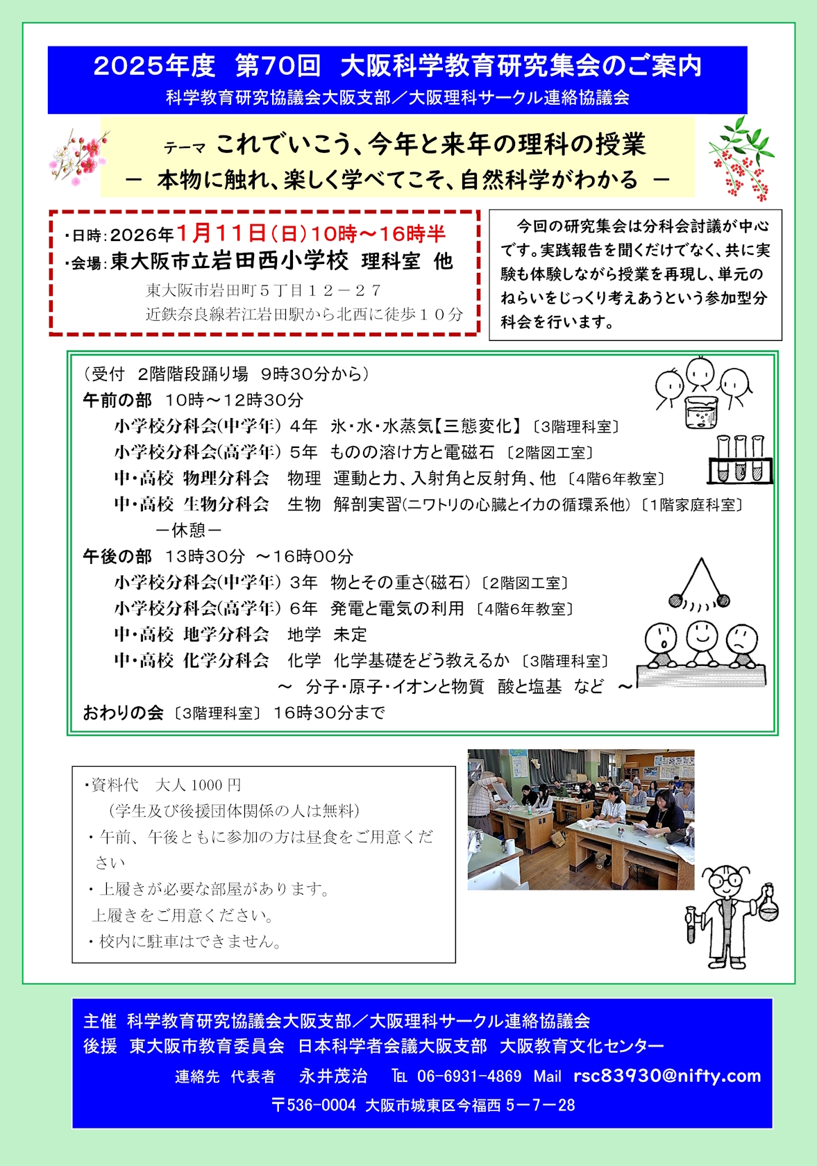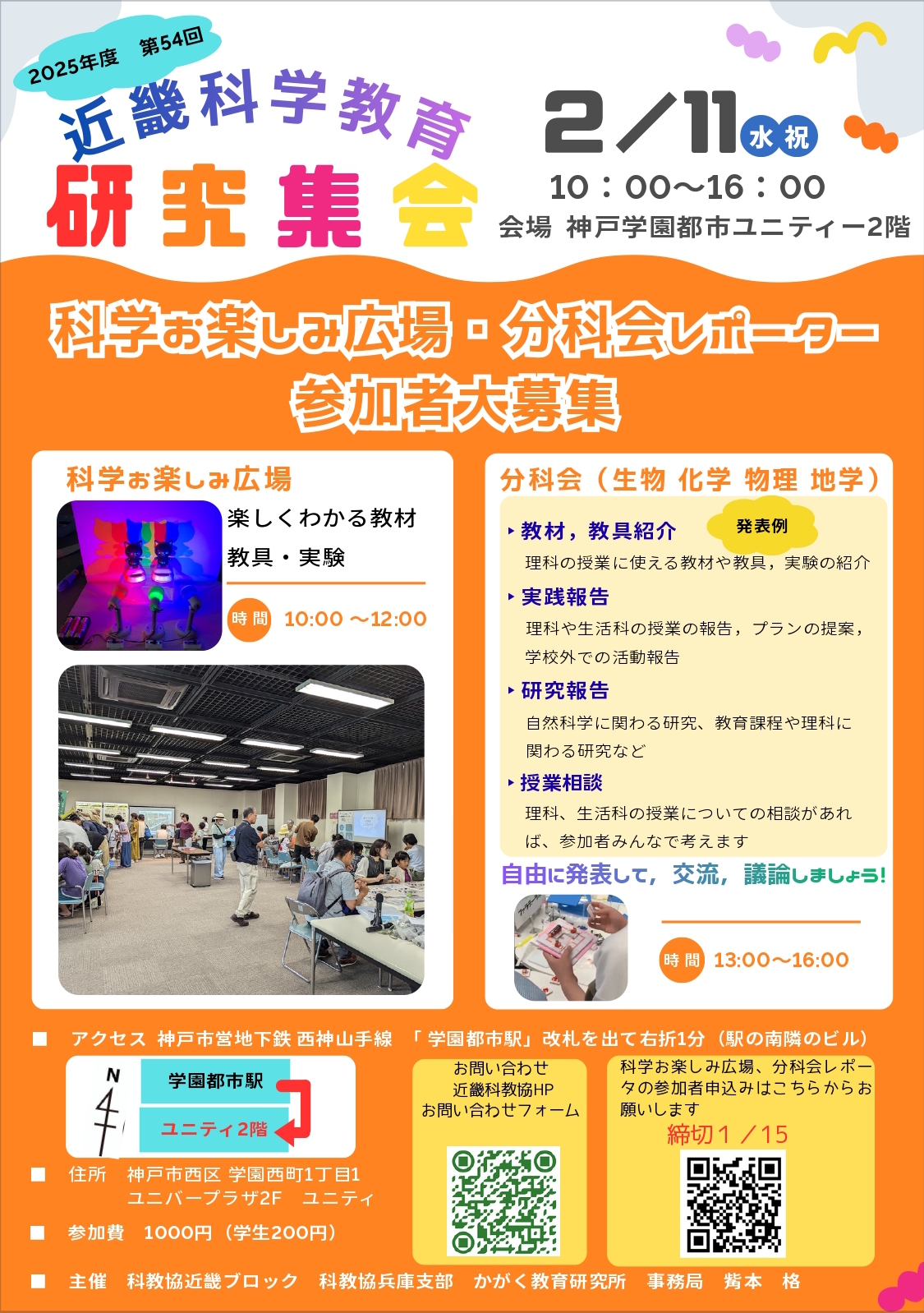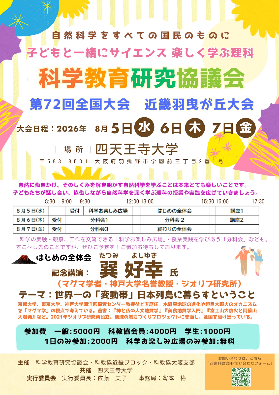 自然科学をすべての国民のものに 2023.10.07 2026年8月5水~7金 大阪・四天王寺大学にて「科教協全国大会」開催(共催) 大阪科学教育研究集会 1/11 事前の申し込み不要 pdf 近畿科学教育研究集会 2/11 申し込み pdf 科教協 全国大会 8/5~7 申し込み準備中 pdf 72th 全国大会(近畿羽曳が丘大会)実行委員会ニュース No.1